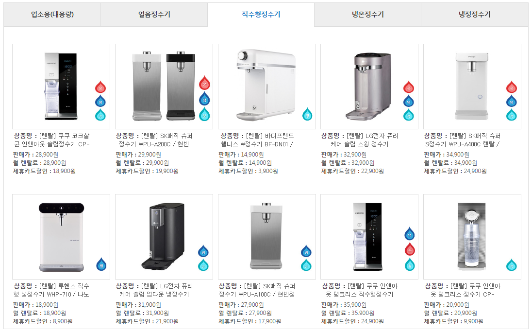이렇게 주변 생필품은 자주 구입해 봤기에 어디서 사야 제일 싼지 알지만 정작 아직까지 많은 사람들이 정수기렌탈을 대체 어디에서 계약을 해야 싸게 하는지 모릅니다.