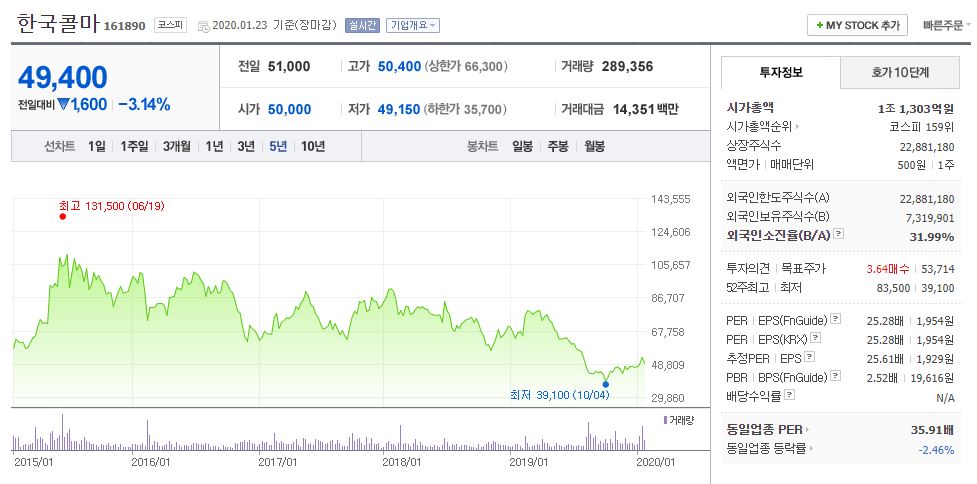 한국콜마마저도 2016년부터 2018년까지 매해 당기 순이익이 계속 줄어들었습니다. 영업이익률은 11%가 넘었던 것이 6%대까지 떨어지게 되었습니다. 2019년에는 여러가지 이슈가 있음에도 조금 반등하는 모습을 보여주었습니다. 그러나 한국콜마의 1년가 주가 변화는 처참합니다. 주식 가격이 2019년 한해에만 반토막 가까이 났기 떄문입니다.