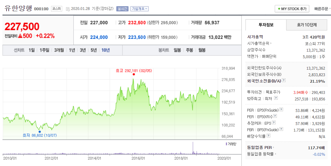 유한양행 주식은 다른 바이오주식에 비해서 크게 주목받지 않는 주식이기도 합니다. 그 이유는 먼저 주주들이나 주가에는 관심이 없는 기업이기 때문입니다. 오로지 사업에 집중해서 연구개발에 몰두하는 기업입니다. 유한양행의 주가는 10년 차트를 본다면 등락이 크지 않다는 점도 봐야합니다. 특히 지난 5년간은 아주 거북이처럼 천천히 주식이 올랐습니다. 매년 무상증자와 주가에 대한 배당을 잘 해온 회사이기 때문입니다. 그만큼 장기투자를 하면 수익률은 나쁘지는 않은 회사입니다.