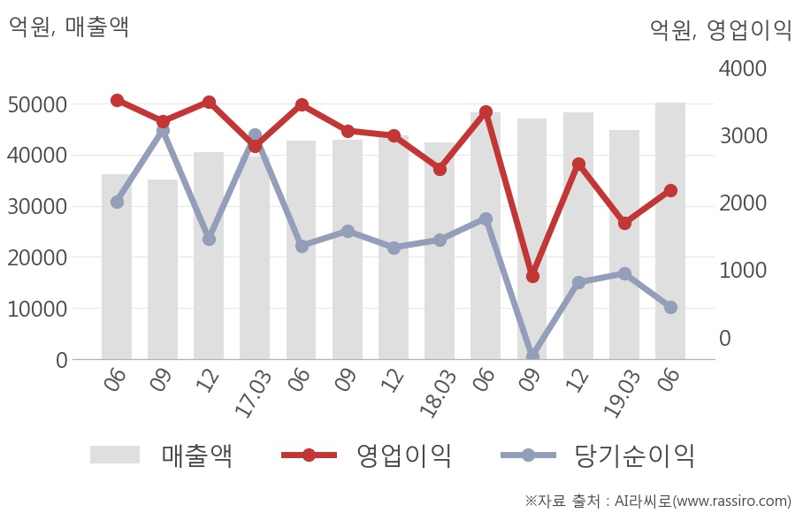 주가가 반토막이 난 가장 큰 이유는 그냥 현대제철의 영업실적이 좋지 않기 때문입니다. 특히 가장 최근 2019년도 3분기 영업이익은 전년도에 비해서 67%가 떨어졌는데요. 주가는 반토막만 난 거라고 위로할 수도 있겠네요.