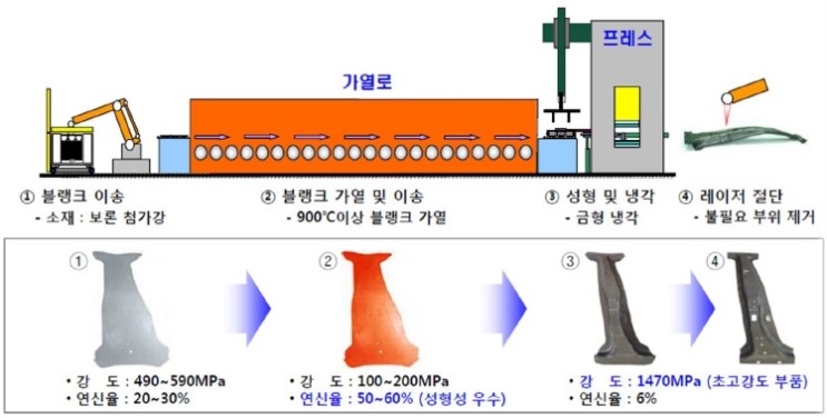 고부가 철강 제조를 위해서 현대제철은 핫스탬핑 공법의 제품을 생산합니다. 핫스템핑 기술이란 금속소재를 900도 이상의 고온에서 프레스한뒤 급랭시켜 철강을 만드는 기술입니다. 기존의 강판 두께를 유지하면서도 2~3배 높은 강도면서도 무게가 15~25% 가벼운 철을 만든다고 합니다. 이것들을 차에 공급한다면 가벼워서 연비가 개선됨은 물론이고 더 단단하기 때문에 안정성까지 확보할 수 있습니다.
