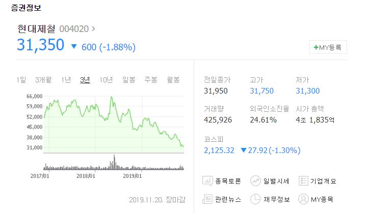현대제철 주식이 거의 2년만에 반토막이 났습니다. 5만 원 6만 원 하던 주식이 현재 3만 1천 원 대까지 떨어졌으니까요.